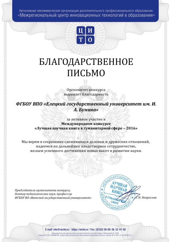 Оргкомитет конкурса «Лучшая научная книга в гуманитарной сфере – 2016» и АНО ДПО «Межрегиональный центр инновационных технологий в образовании» выражают благодарность ФГБОУ ВО «Елецкий государственный университет имени И.А. Бунина» за активное участие в данном международном конкурсе и желают нашему университету успешного достижения новых высот в развитии науки.
