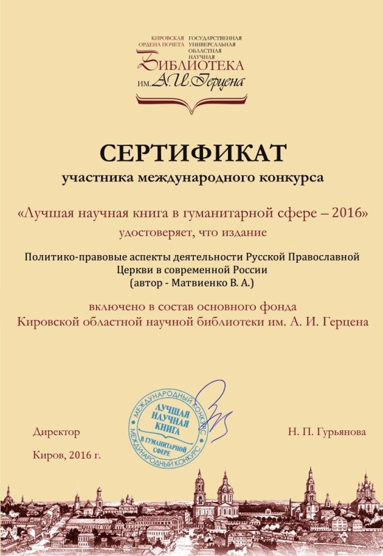 Доцент кафедры туризма и гостиничного дела, кандидат политических наук Матвиенко В.А. стала дипломированным лауреатом международного конкурса «Лучшая научная книга в гуманитарной сфере – 2016» в номинации «Философия; социология; политология; правоведение» за свою работу «Политико-правовые аспекты Русской Православной Церкви в современной России».