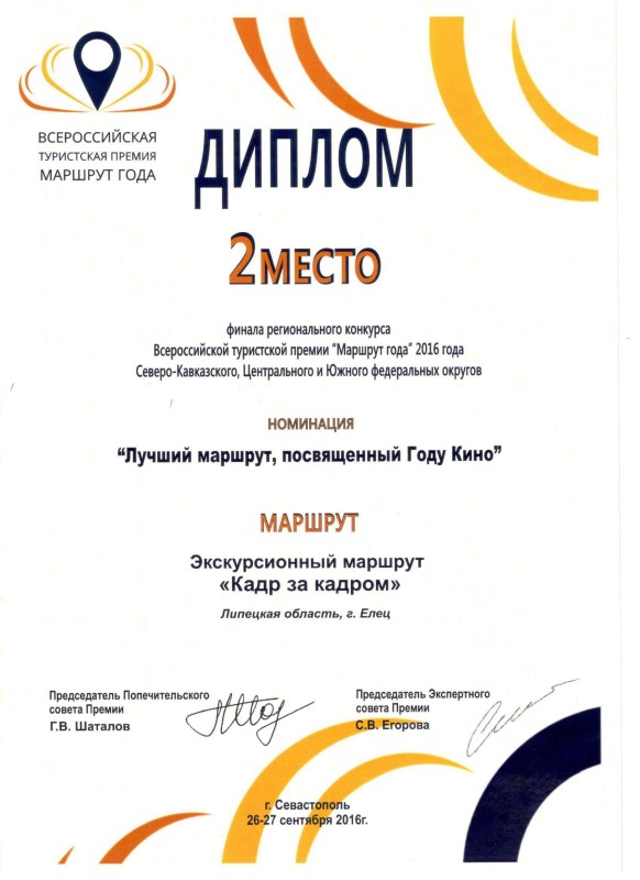 26-27 сентября 2016 года г. Севастополь проходил финал регионального конкурса Всероссийской туристской премии «Маршрут года» 2016 года Северо - Кавказского, Центрального и Южного федеральных округов РФ. Из 25 регионов нашей страны на конкурс было принято всего 179 проектов. Липецкую область на данном конкурсе представляла директор Елецкого туристско-информационного центра, доцент кафедры туризма и гостиничного дела института истории и культуры ЕГУ им. И.А. Бунина М.А. Стрельникова. Представленный Мариной Анатольевной экскурсионный маршрут «Кадр за кадром», занял почётное второе место в финале данного конкурса в номинации «Лучший маршрут, посвященный Году Кино». Финал Всероссийской туристской премии «Маршрут года» пройдет 18 – 19 ноября 2016 года в г. Воронеж.