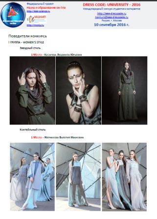 Поздравляем заведующую кафедрой дизайна и НХК Мальцеву В.А., занявшую в рейтинге научных руководителей TOP-3 первое место в Международном конкурсе студентов и аспирантов "DRESS CODE: UNIVERSITY-2016" - Проект Интеллектуальное развитие молодых ученых (Федеральный проект Наука и образование on-line Международного центра научно-исследовательских проектов (МЦНИП))!!!