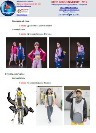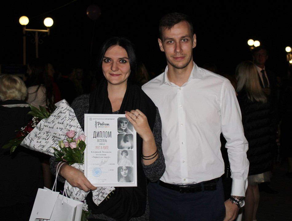 Среди 40 участников в номинации «PRET-A-PORTE» Международное жюри отметило автора коллекции из шести мужских моделей одежды под девизом «Переступи черту» Косареву Людмилу (ДЗм-21). Магистрант института истории и культуры завоевала третье место и получила приглашение от итальянских представителей конкурса к участию в Римской неделе моды весной 2017 года.