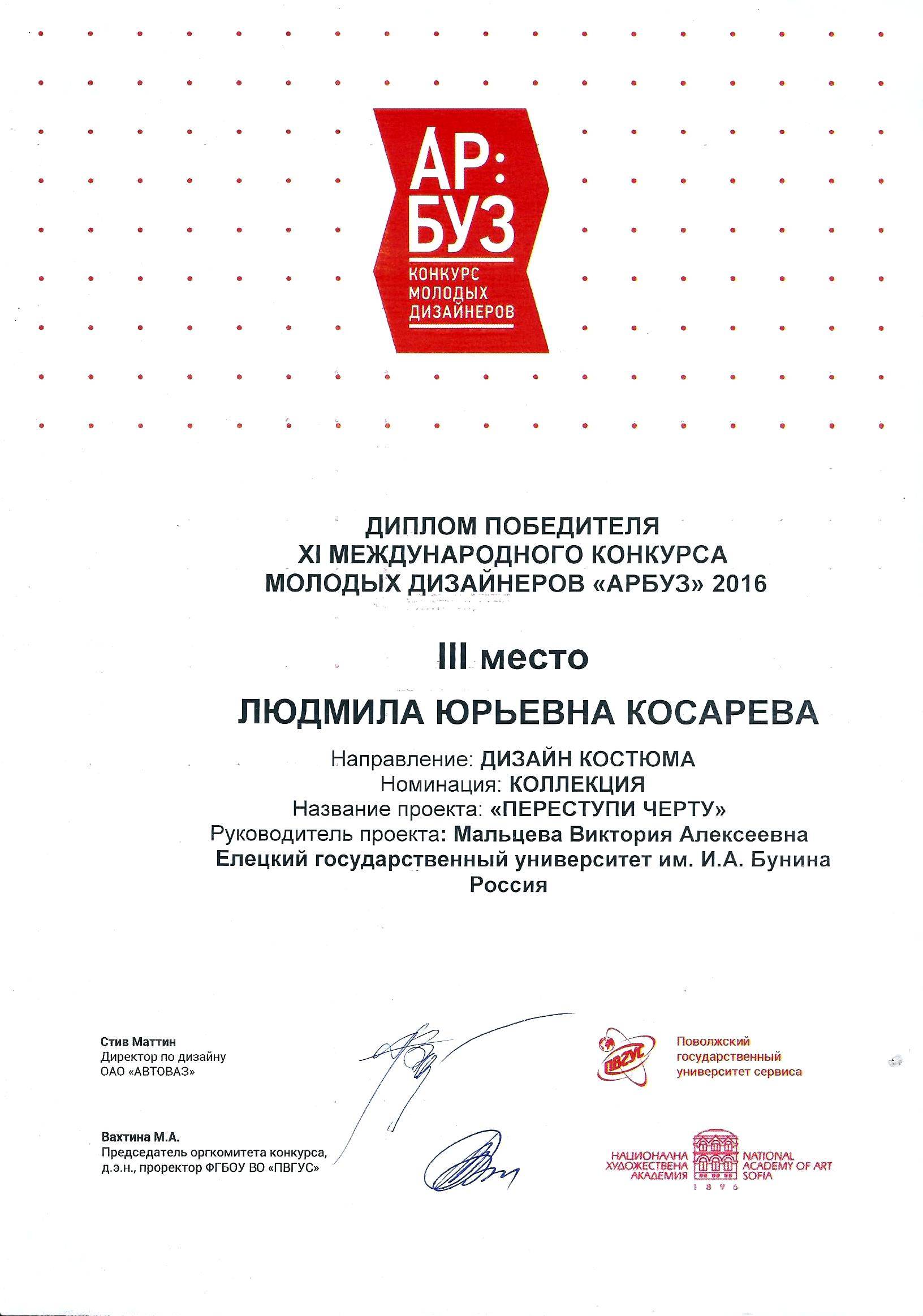 Магистрант 2 курса института истории и культуры Л.Ю. Косарева заняла III место на Международном конкурсе молодых дизайнеров «Арбуз-2016», проходившем в г. Тольятти. Научный руководитель – заведующая кафедрой дизайна и народной художественной культуры Мальцева Виктория Алексеевна.
