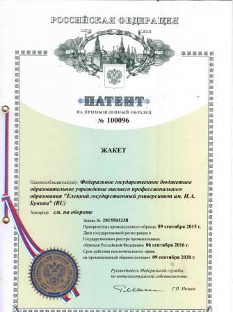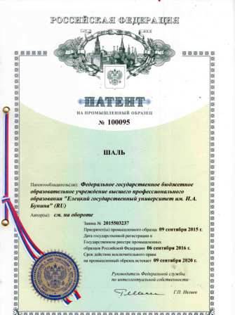 Плодотворная работа коллектива кафедры дизайна и народной художественной культуры и студентов института истории и культуры: Мальцева В.А., Шаталова Л.С., Мезинова О.Н. (ПО Шаль); Мальцева В.А., Шаталова Л.Н., Фомина Н.П. (ПО Жакет) принесла очередные достижения в «копилку» нашего университета - 2 патента на промышленные образцы Шаль и Жакет.