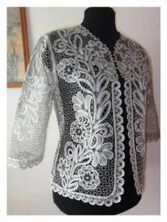 Шаль отличает оригинальный растительный орнамент из стилизованных цветов и листьев; декорирование края изделия вилюшкой разного ритмического содержания; акцентированное расположение орнамента вдоль вертикальной оси симметрии. Жакет характеризуется оригинальным растительным орнаментом стилизованной цветущей ветви; композиционным расположением элементов орнамента и сетки на поверхности изделия; декорированием края изделия имитацией мерного краевого кружева; прилегающим силуэтом.