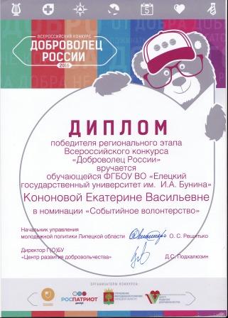 Диплом победителя регионального этапа Всероссийского форума добровольцев в номинации «Событийное волонтерство» получила студентка группы И-42 института истории и культуры ЕГУ им. И.А. Бунина Кононова Екатерина Васильевна.