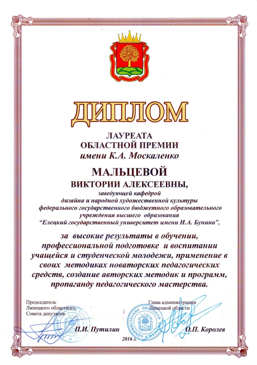 За высокие результаты в обучении, профессиональной подготовке и воспитании учащейся и студенческой молодежи, применение в своих методиках новаторских педагогических средств, создание авторских методик и программ, пропаганду педагогического мастерства премию им. К.А. Москаленко получила заведующая кафедрой дизайна и НХК ЕГУ им. И.А. Бунина Виктория Алексеевна Мальцева. А днем ранее ей был вручен диплом Международного конкурса молодых дизайнеров и модельеров «Подиум» за предоставление на высоком профессиональном уровне творческих разработок.