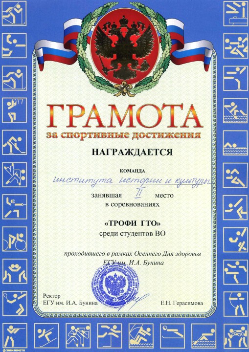 На имя ректора ЕГУ им. И.А. Бунина Е.Н. Герасимовой поступило благодарственное письмо от ректора Волгоградского государственного университета Тараканова В.В. за оказание содействие в организации Всероссийского историко-патриотического культурно-просветительского молодёжного форума «Рубежи побед» (2-6 ноября 2016 г., г. Волгоград). В письме сказано «Студенты Вашего университета проявили себя активными участниками Форума, презентовали положительные практики реализации программ по патриотическому воспитанию в студенческой среде. Надеемся на дальнейшее плодотворное сотрудничество в области патриотического воспитания молодёжи».