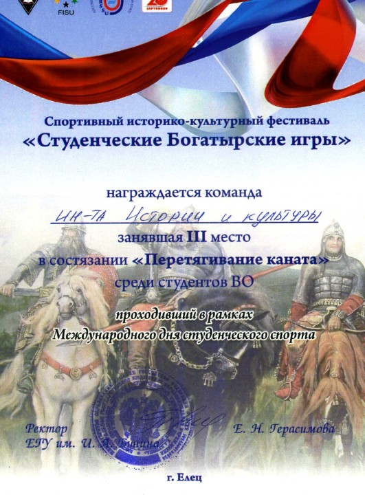19 сентября 2016 года студентам Института истории и культуры ЕГУ им. И.А. Бунина Ермоловой О.А. и Васильевой А.В. (научный руководитель доцент, к.и.н. Щукин Д.В.) были вручены долгожданные сертификаты Национального исследовательского Томского государственного университета РФ (ТГУ) за их работы и участие в XII Международной научно-практической конференции студентов, магистрантов, аспирантов и молодых ученых «Актуальные вопросы истории, международных отношений и документоведения». Решением Оргкомитета данной конференции под председательством декана Исторического факультета ТГУ, д-р ист. наук, профессора В.П. Зиновьева их работы вошли в сборник научных статей данной конференции, который будет размещён в наукометрической базе Российского индекса научного цитирования. Поздравляем наших студентов и их научного руководителя с очередным успехом в научно-исследовательской деятельности!
