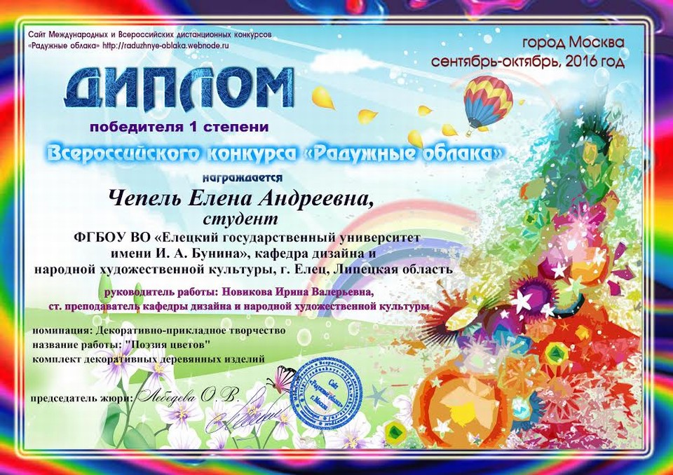 Поздравляем магистранта 1 курса отделения дизайна Института истории и культуры Чепель Елену Андреевну (руководитель старший преподаватель кафедры дизайна и народной художественной культуры И.В. Новикова) с победой во Всероссийском конкурсе «Радужные облака» в номинации Де-коративно-прикладное творчество (г. Москва).