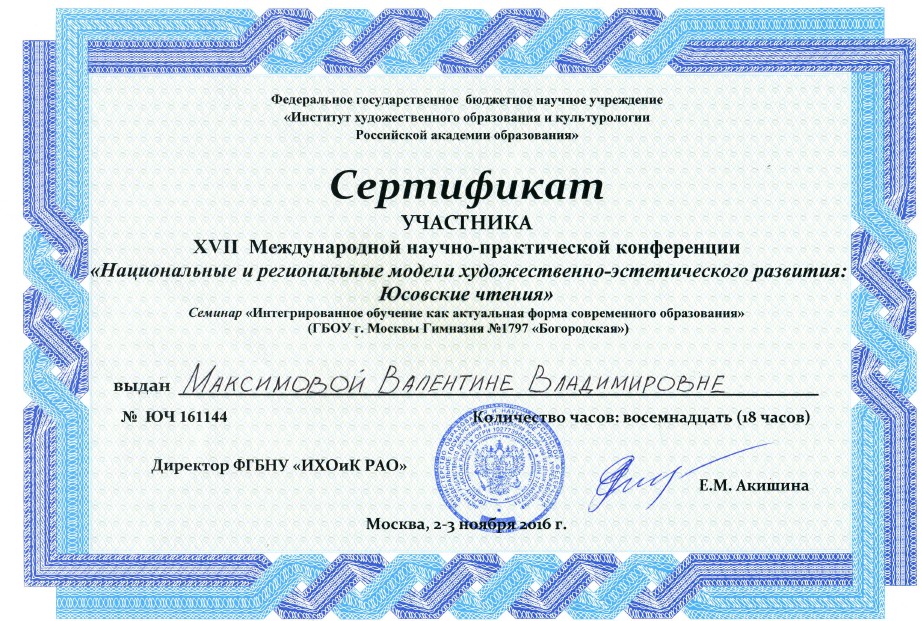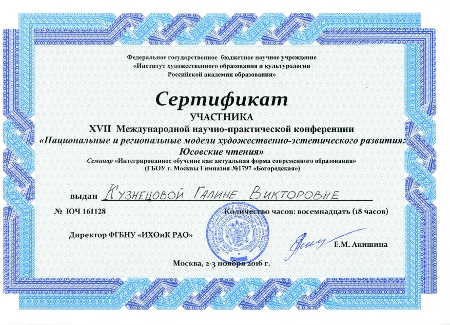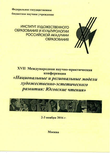 2 - 3 ноября 2016 года на базе Федерального государственного бюджетного научного учреждения "Институт художественного образования и культурологии Российской академии Образования" (г. Москва) проходила XVII Международная научно-практическая конференция «Национальные и региональные модели художественно-эстетического развития: Юсовские чтения».