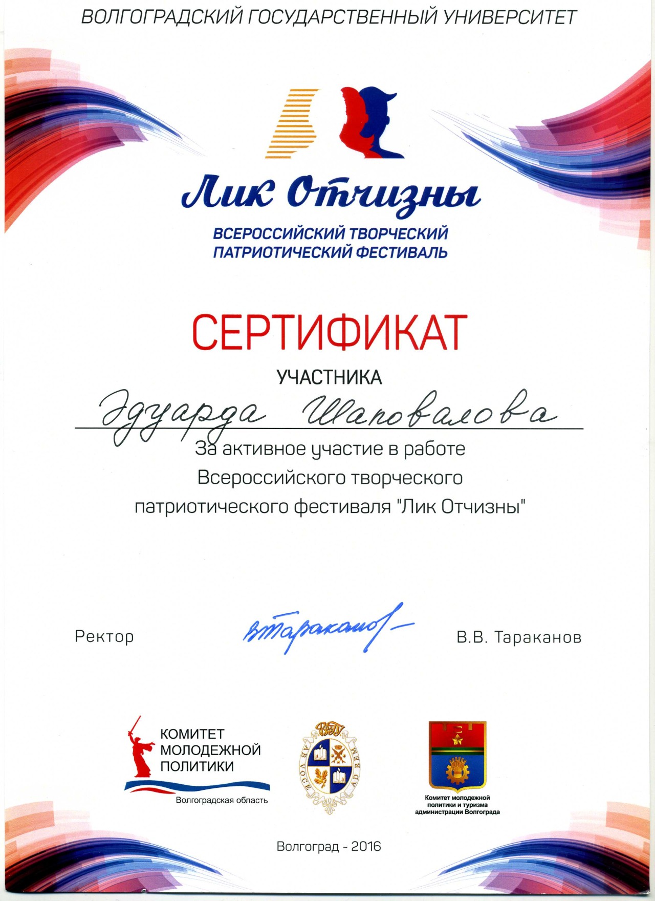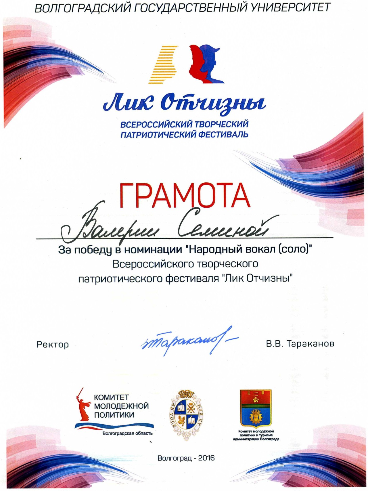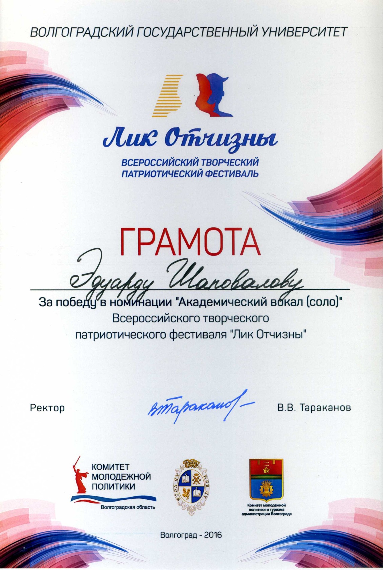 2 - 6 ноября 2016 года в городе Волгограде состоялся Всероссийский историко-патриотический культурно-просветительский молодёжный форум «Рубежи побед» на базе Волгоградского государственного университета. В рамках этого форума состоялся Всероссийский творческий патриотический фестиваль «Лик Отчизны». В форуме и фестивале приняли участие студенты Елецкого государственного университета им. И.А. Бунина музыкального отделения института истории и культуры – Сёмина Валерия, гр. МП-22, и Шаповалов Эдуард, гр. МП-32. Шаповалов Эдуард, класс преподавателя Дубровского Владимира Викторовича, стал победителем в номинации «Академический вокал» (соло), а Сёмина Валерия, класс преподавателя Кириченко Татьяны Дмитриевны, одержала победу в номинации «Народный вокал» (соло).