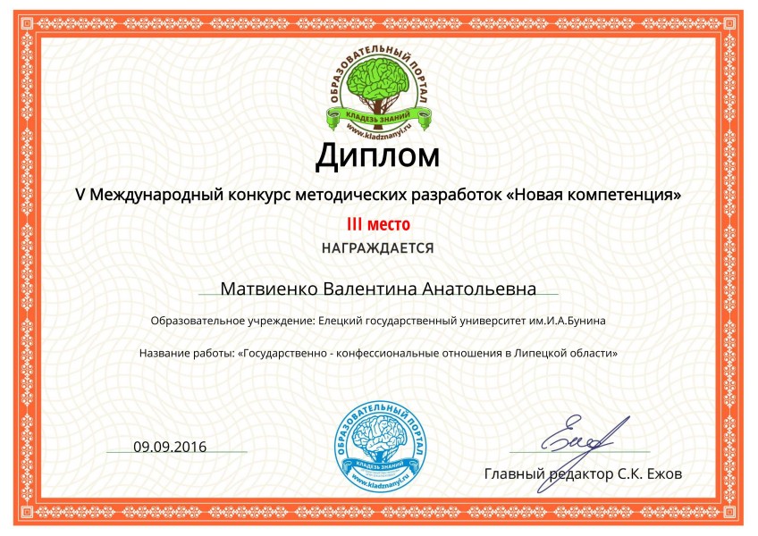 Отметим, что представленная на конкурс работа далеко не первая в общем перечне научных трудов Валентины Анатольевны Матвиенко одного из ведущих специалистов Липецкой области по вопросам религиозно-конфессиональных отношений и государственной политики в данной сфере.